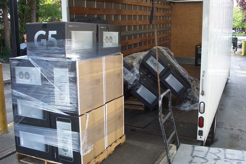 The image on the left shows a rather large delivery of PowerMac G5s that was delivered to Microsoft! This photo was taken by Michael Hanscom who was a contractor working for the MSCopy print Shop at the time (He was fired for posting this photo to his blog) 1.